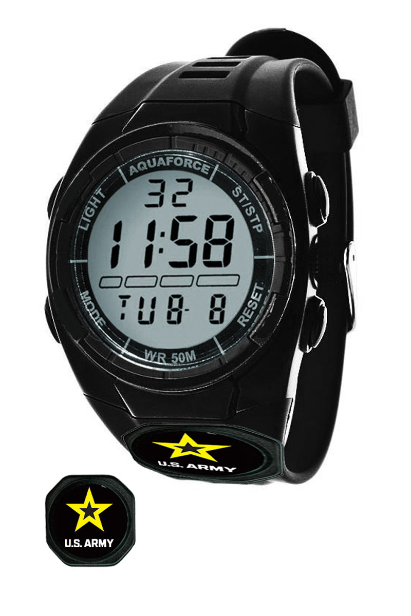 Water Resistant with stop watch, timer, and New U.S. Army Star logo