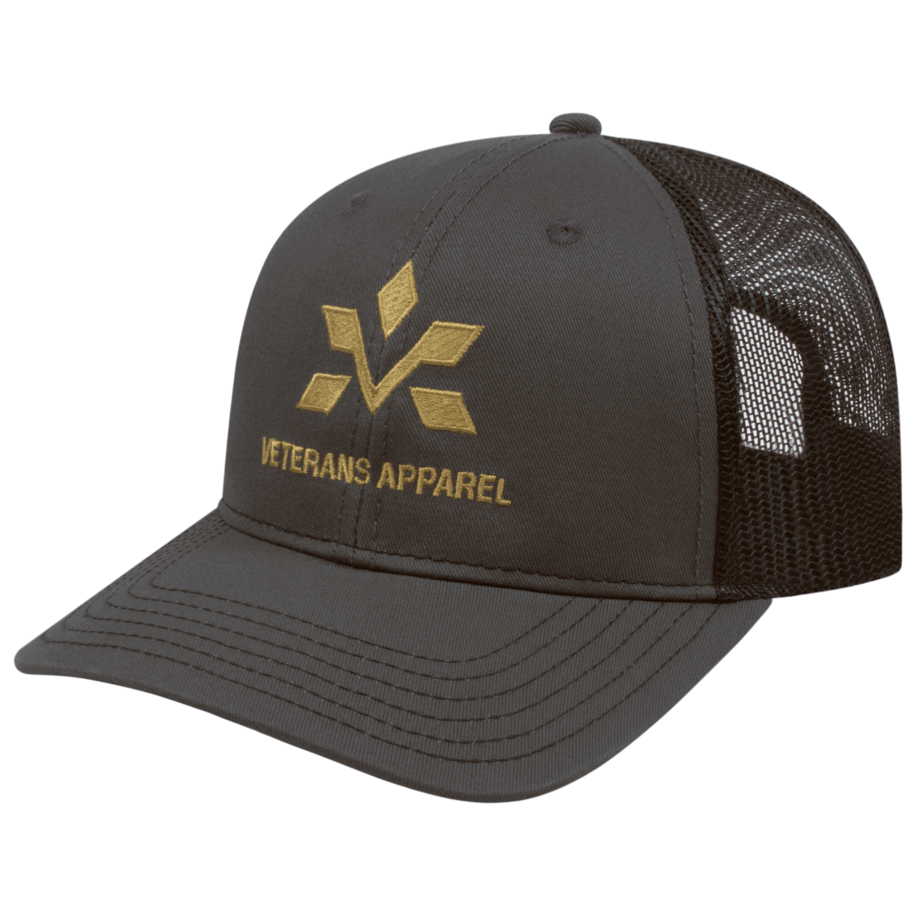 Cotton Poly Veterans Apparel Logoed Trucker Mesh Back Cap with snap back closure
